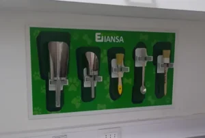 Un tablero no es solo un adorno; es el centro de control del área. En la imagen de nuestro proyecto para Empresas Iansa, vemos un tablero diseñado con compartimentos de acrílico para: